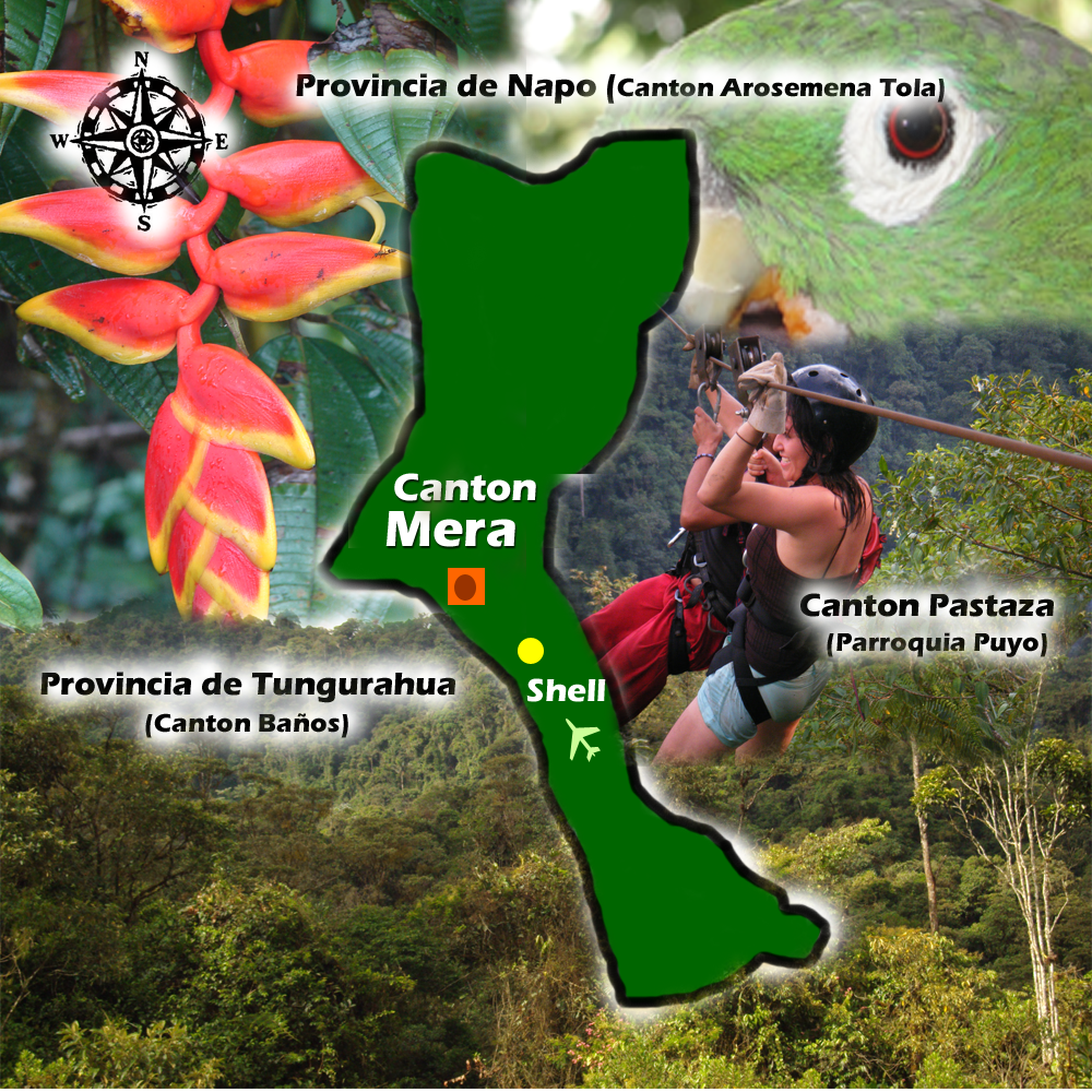 El canton Mera se encuentra ubicado en el extremo oeste de la provincias de Pastaza. Es el canton mas pequeño de todos, se encuentra ubicado en la ceja de montaña, rodeado de los Parques Nacionales LLanganates y Sangay, en el corredor ecol´´ogico declarado en el año 2001 como "Regalo para la Tierra" por el Fondo Mundial para la Naturaleza WWF, por sus caracteristicas biologiocas que la hacen ´´unica en el mundo, ademas posee varios bosques protectores: el del Cerro Habitahua y el del sector de La Moravia.